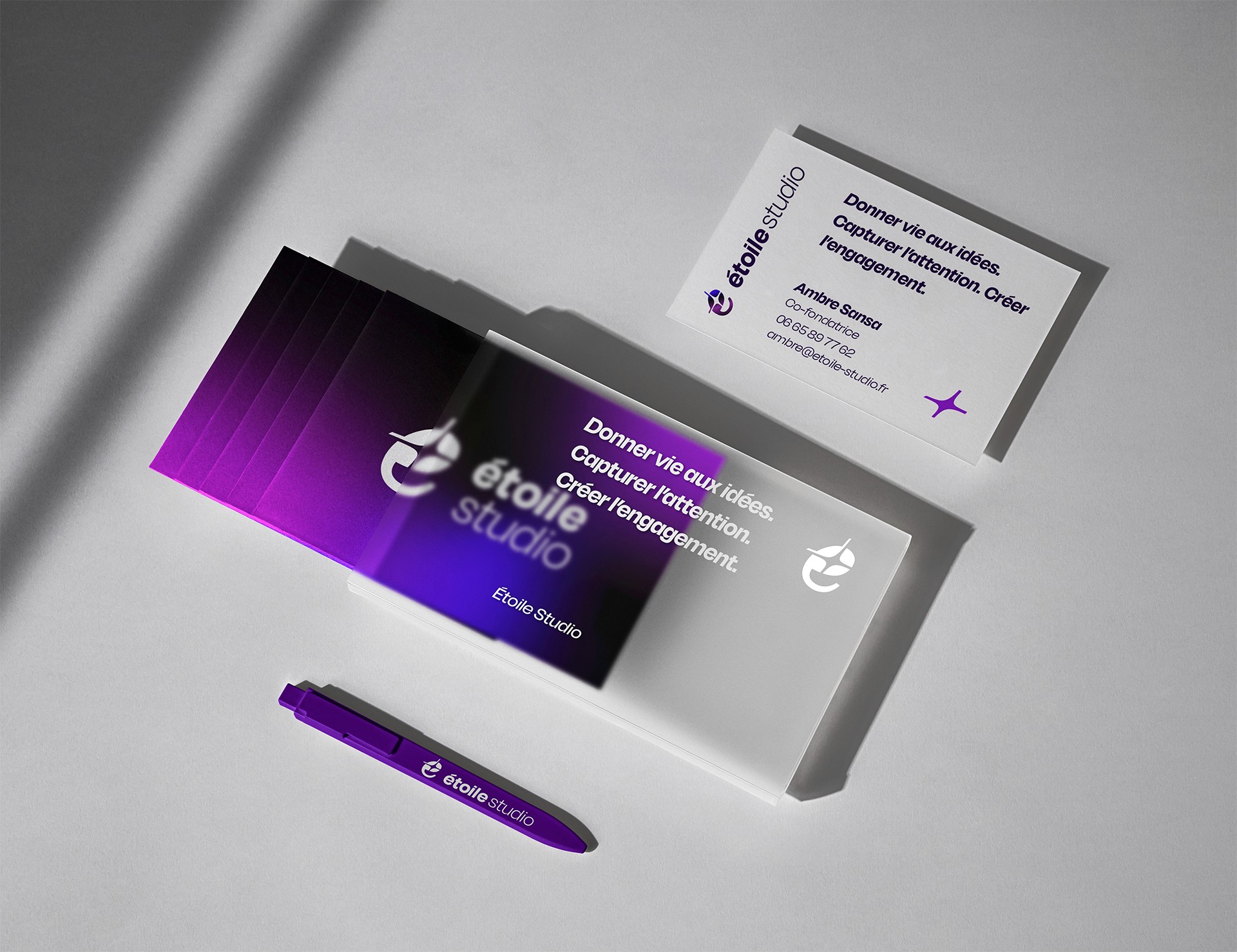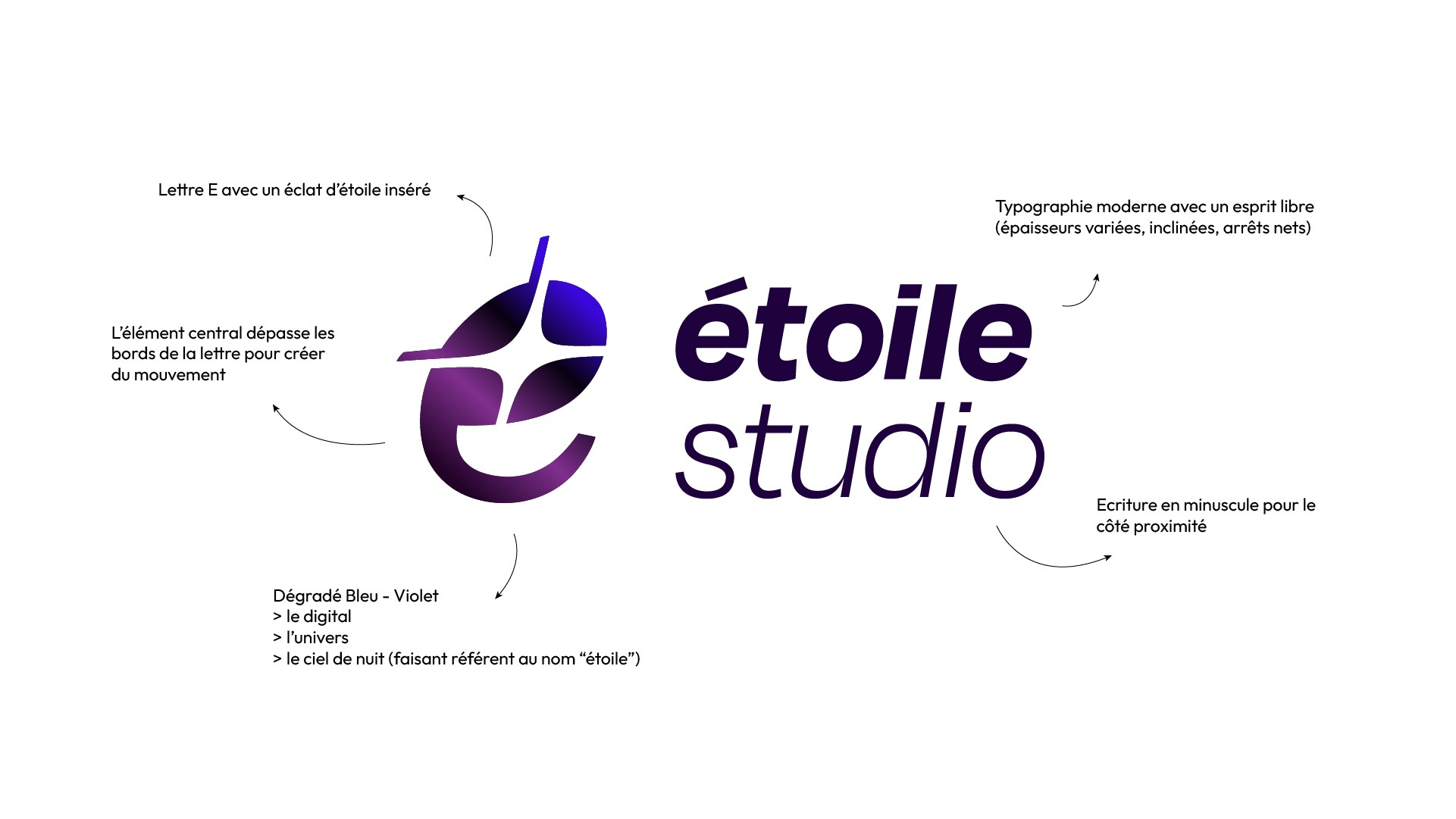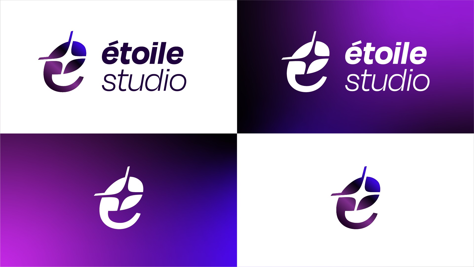 L’identité s’appuie sur un dégradé foncé de bleu et de violet, des couleurs associées au digital et à l’univers du web. Elles évoquent également le ciel nocturne et l’imaginaire de l’étoile, renforçant ainsi le lien symbolique avec le nom du studio.