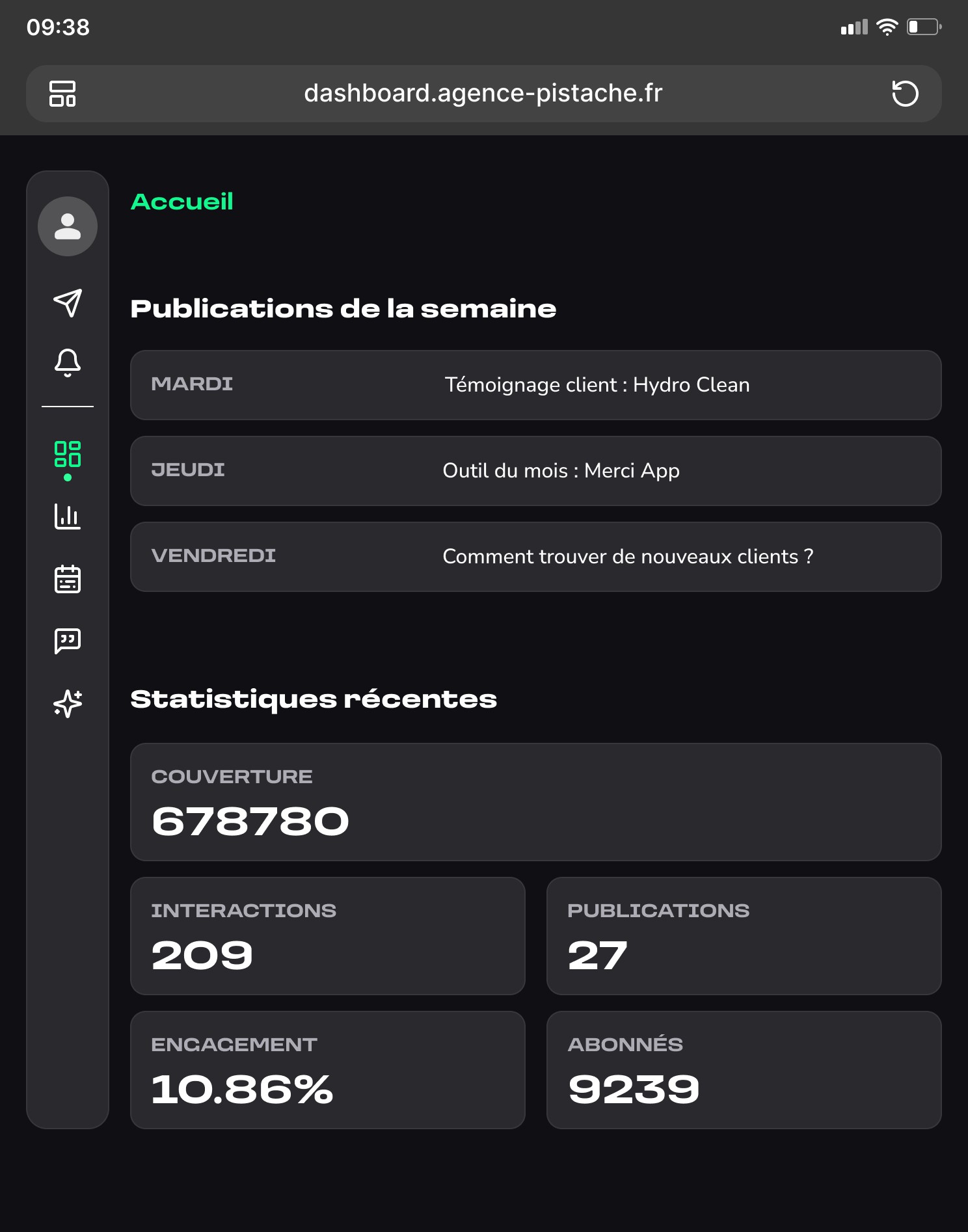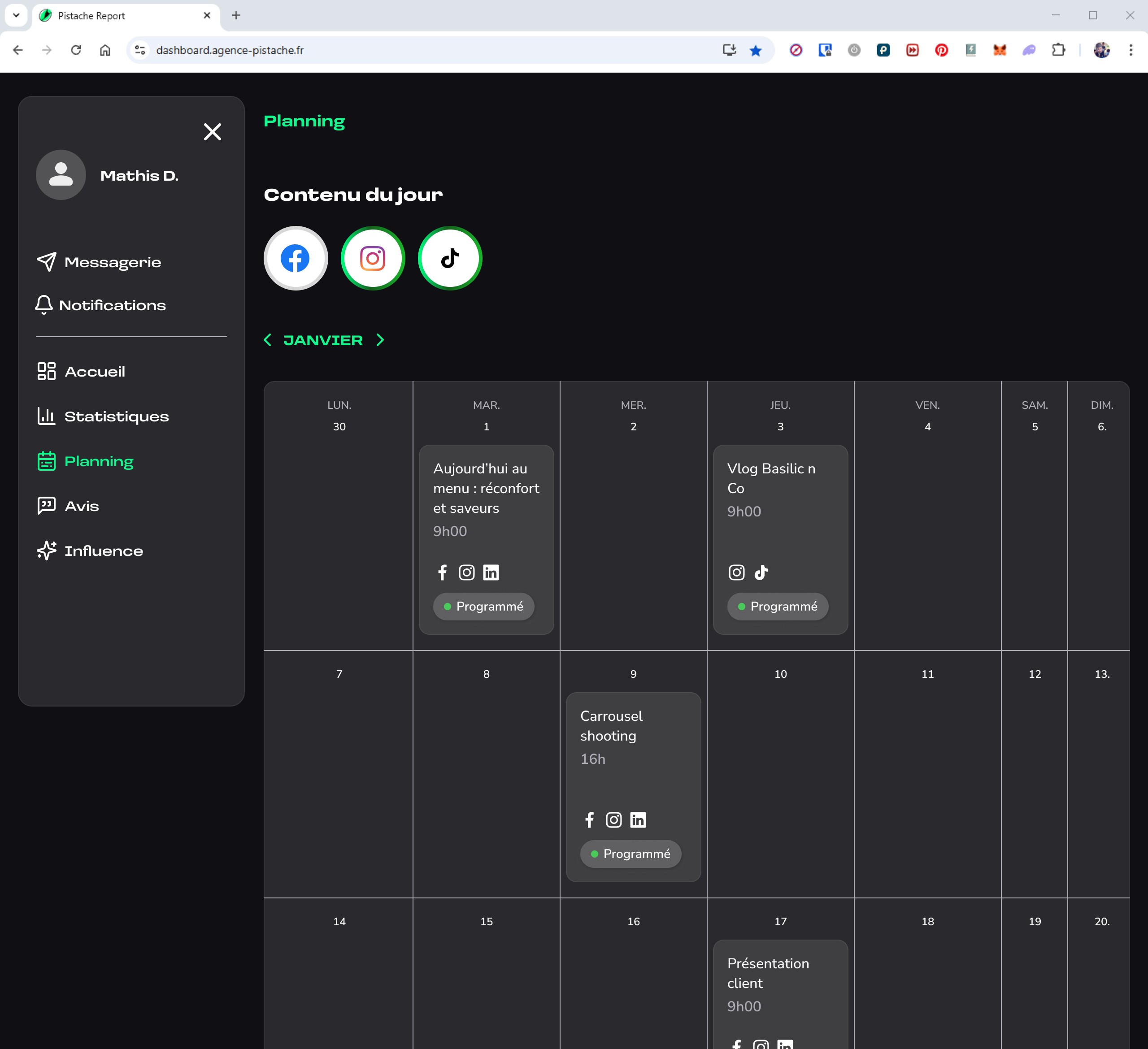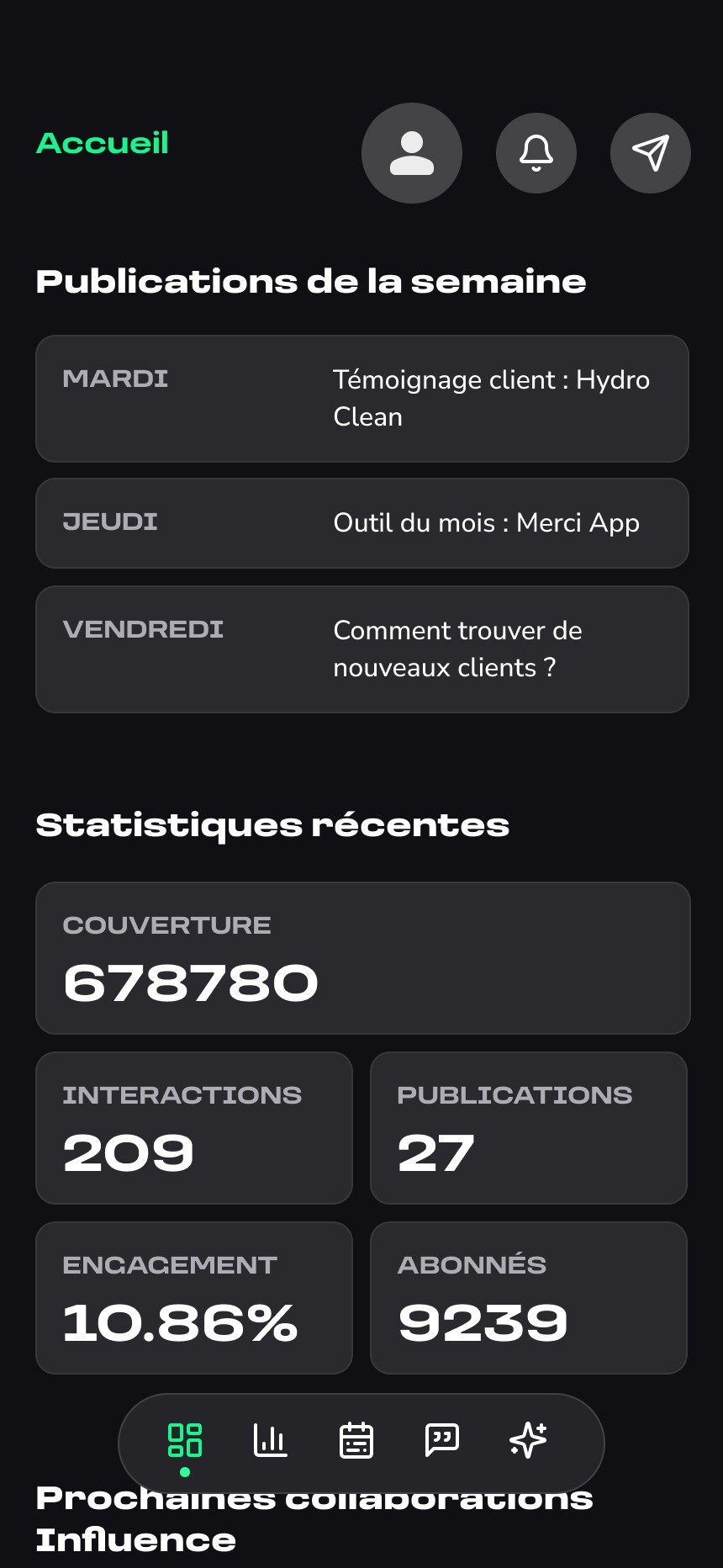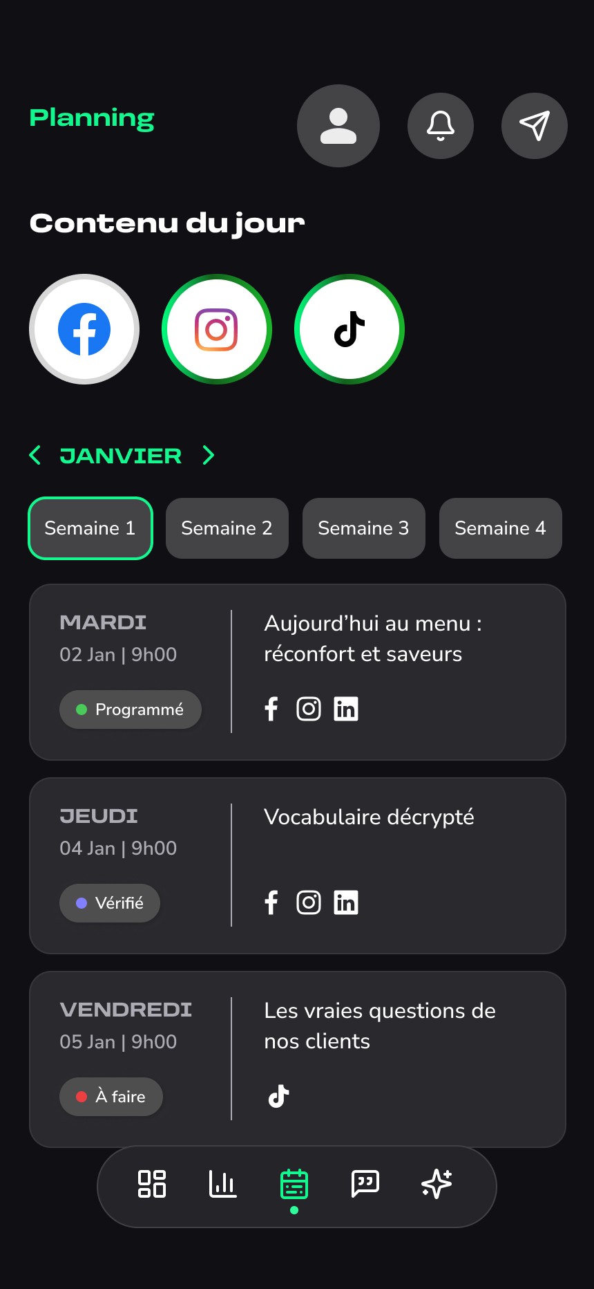 La seconde partie donne accès à un espace de gestion, où l’utilisateur peut consulter le planning des publications, valider ou ajuster les contenus générés, et suivre à terme différentes informations liées à sa présence en ligne.