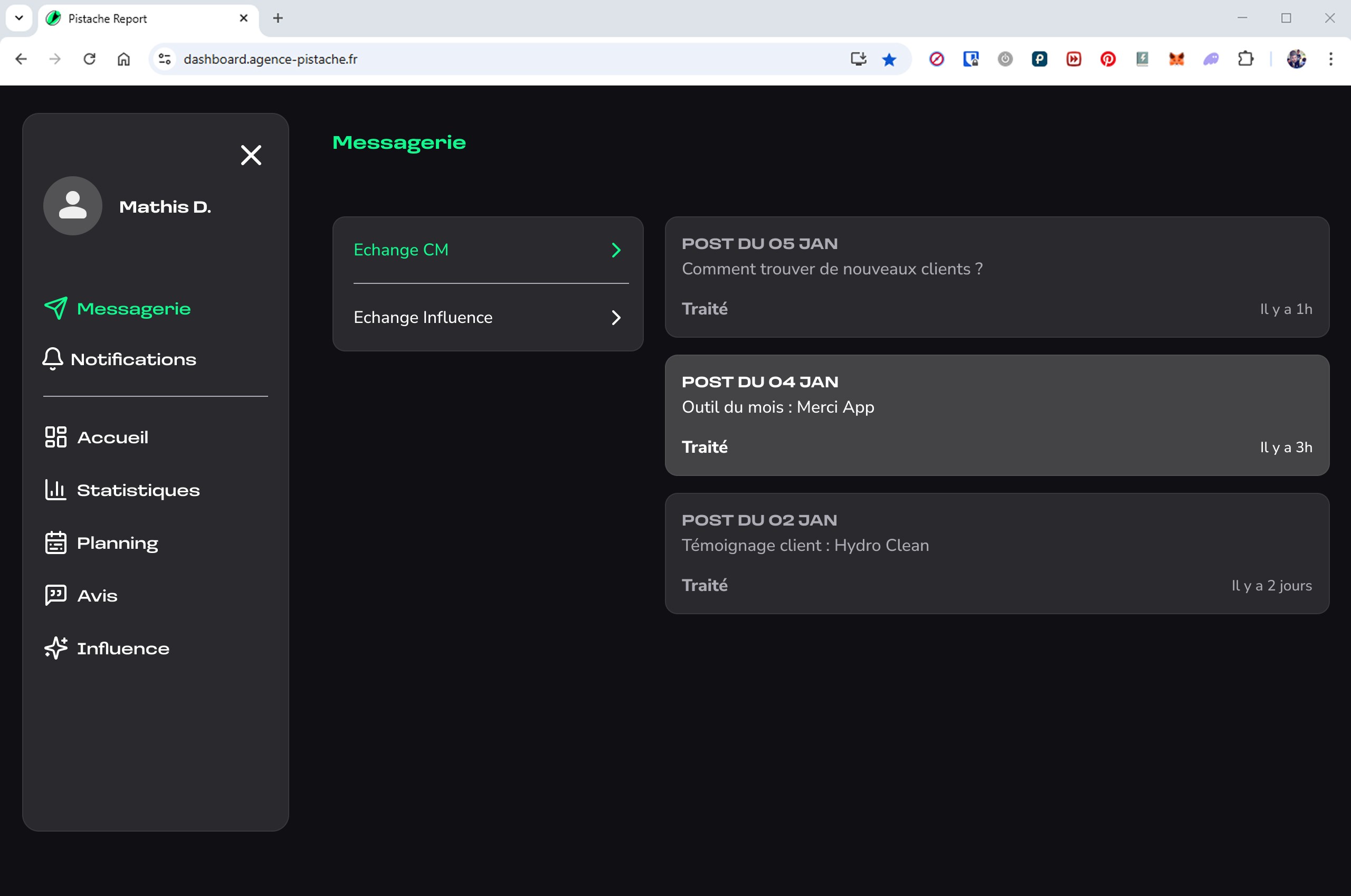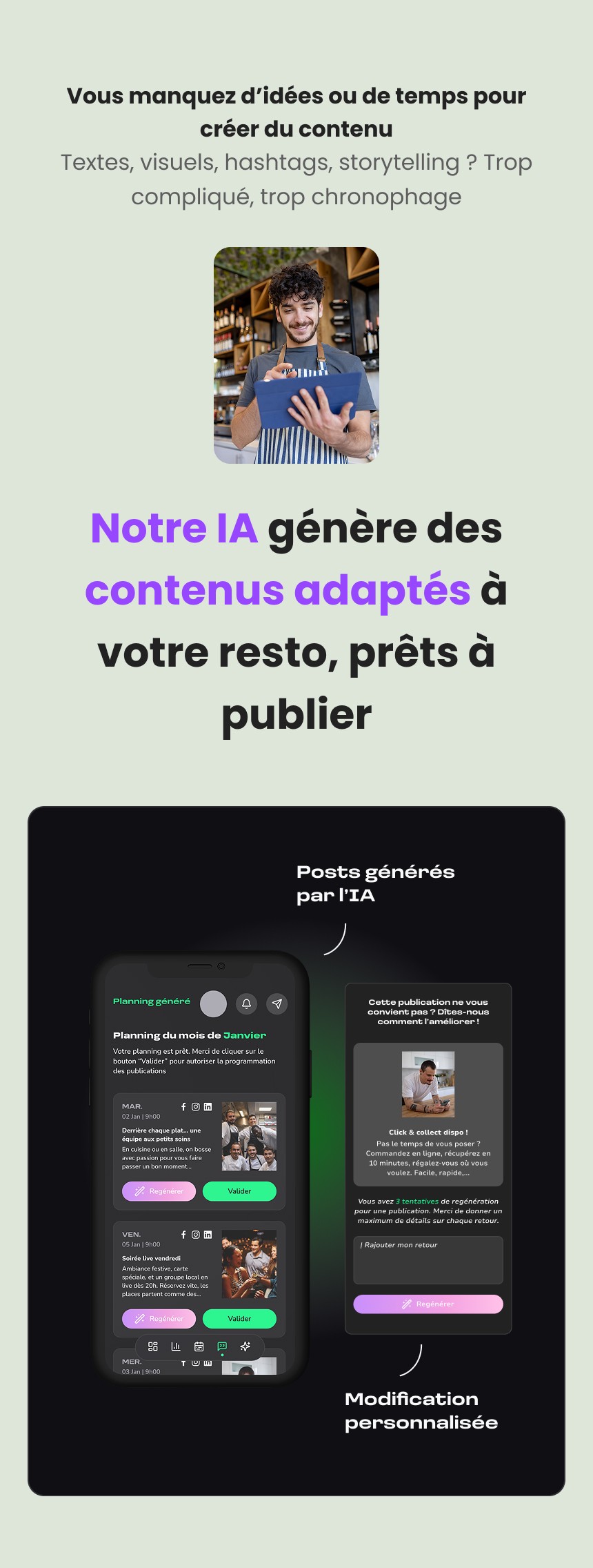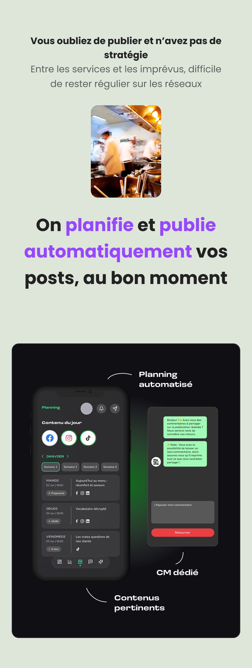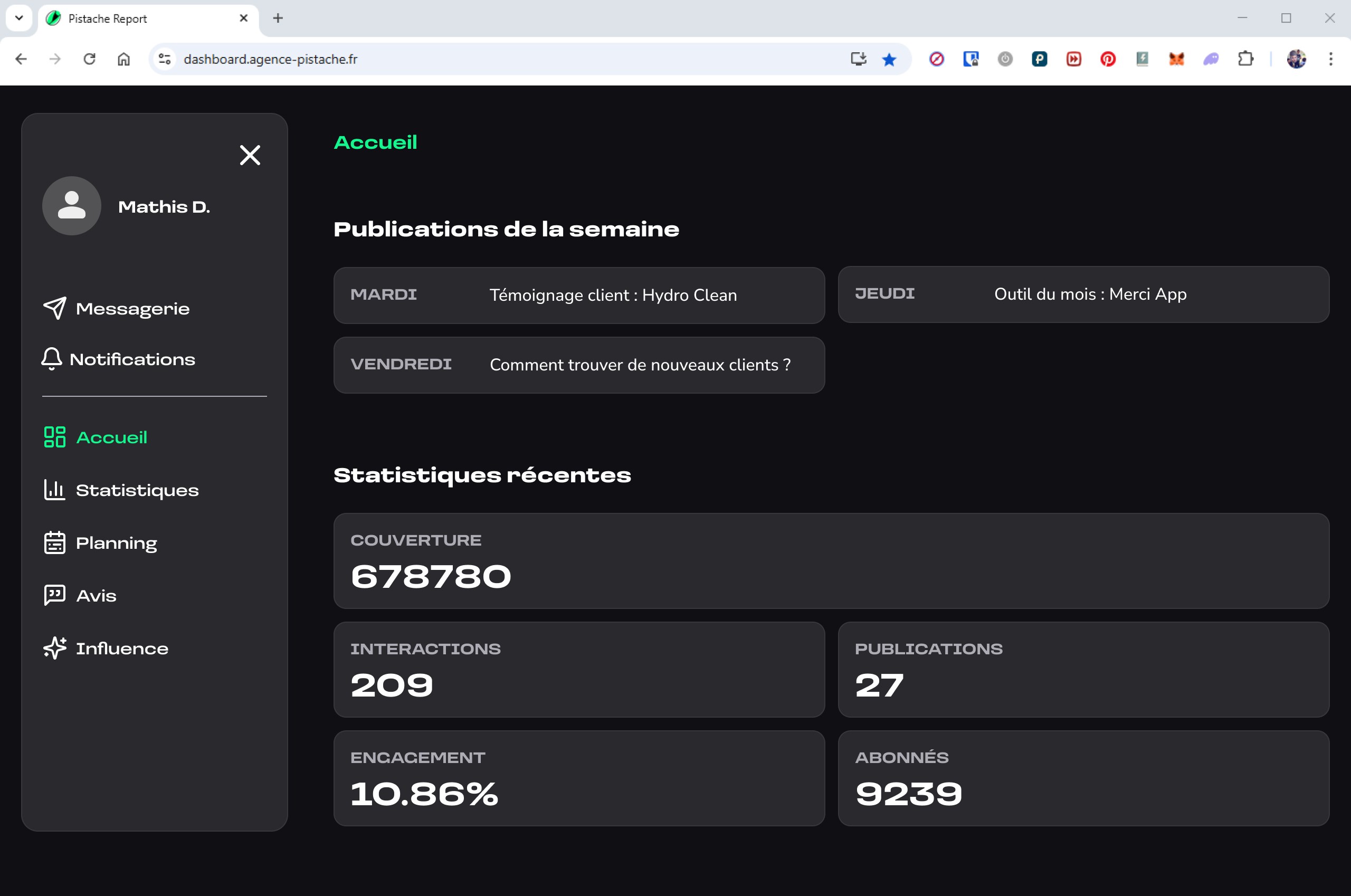 La seconde partie donne accès à un espace de gestion, où l’utilisateur peut consulter le planning des publications, valider ou ajuster les contenus générés, et suivre à terme différentes informations liées à sa présence en ligne.