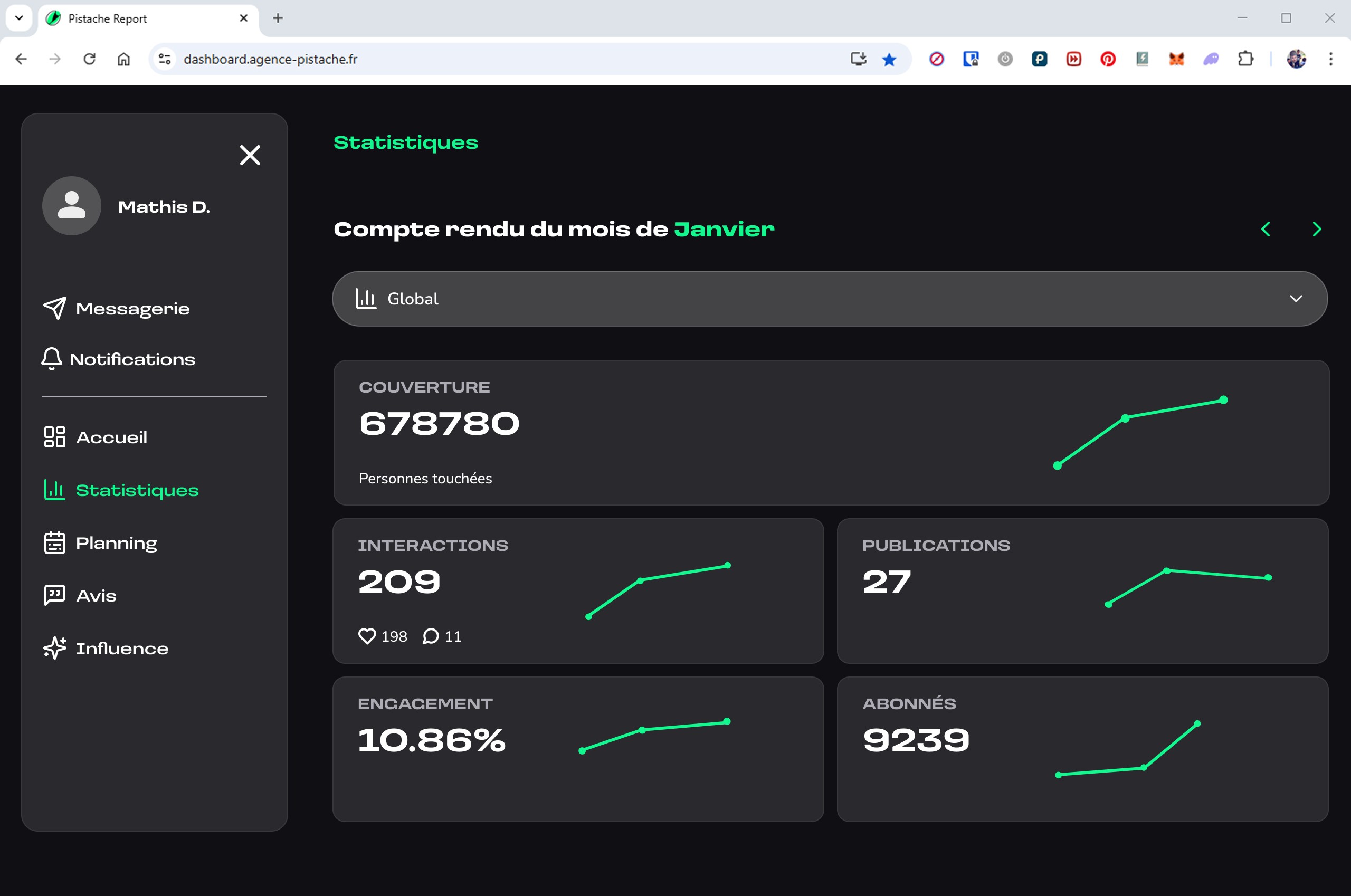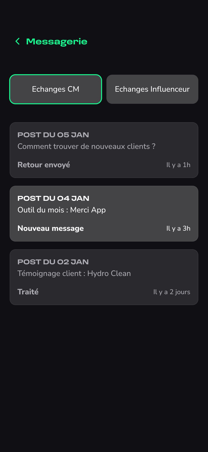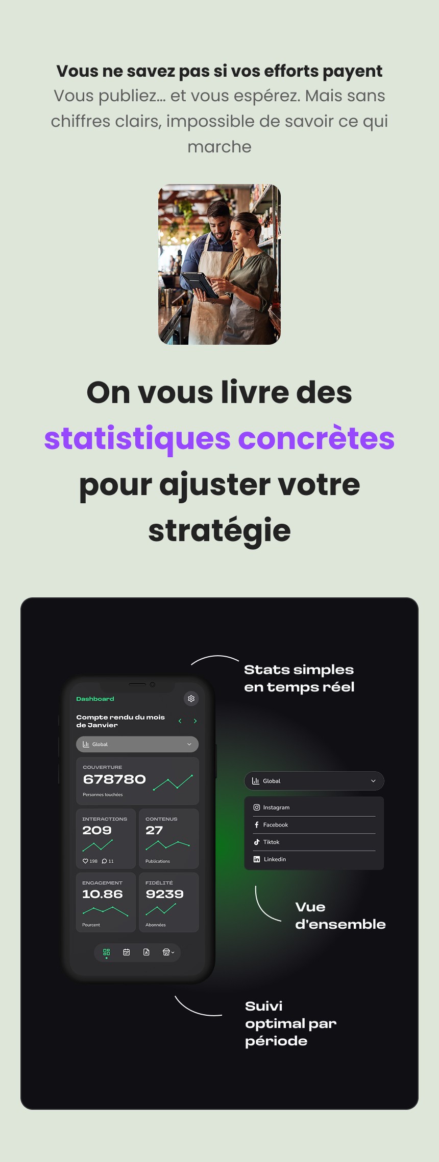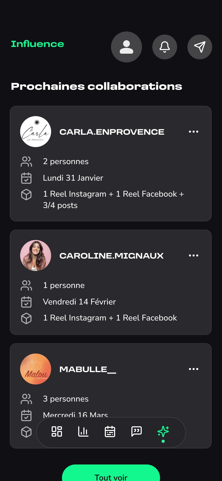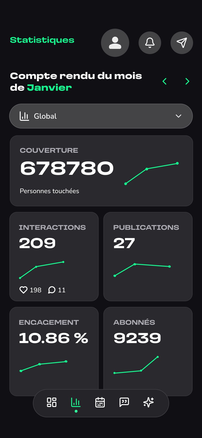 La seconde partie donne accès à un espace de gestion, où l’utilisateur peut consulter le planning des publications, valider ou ajuster les contenus générés, et suivre à terme différentes informations liées à sa présence en ligne.