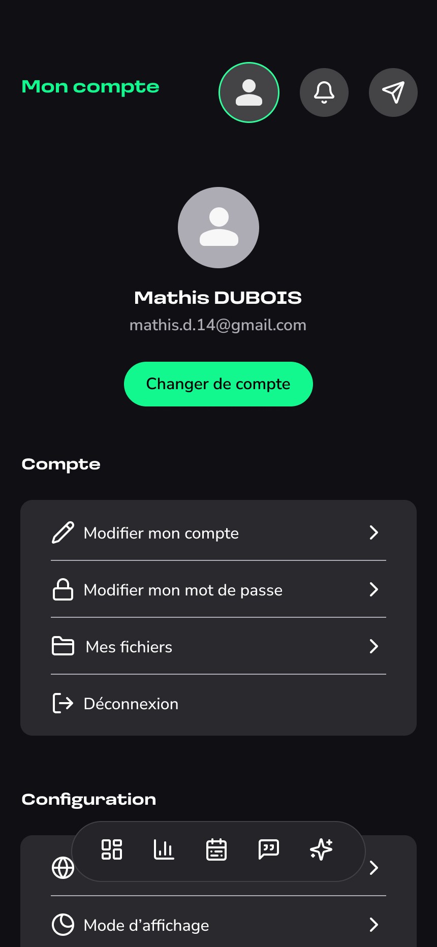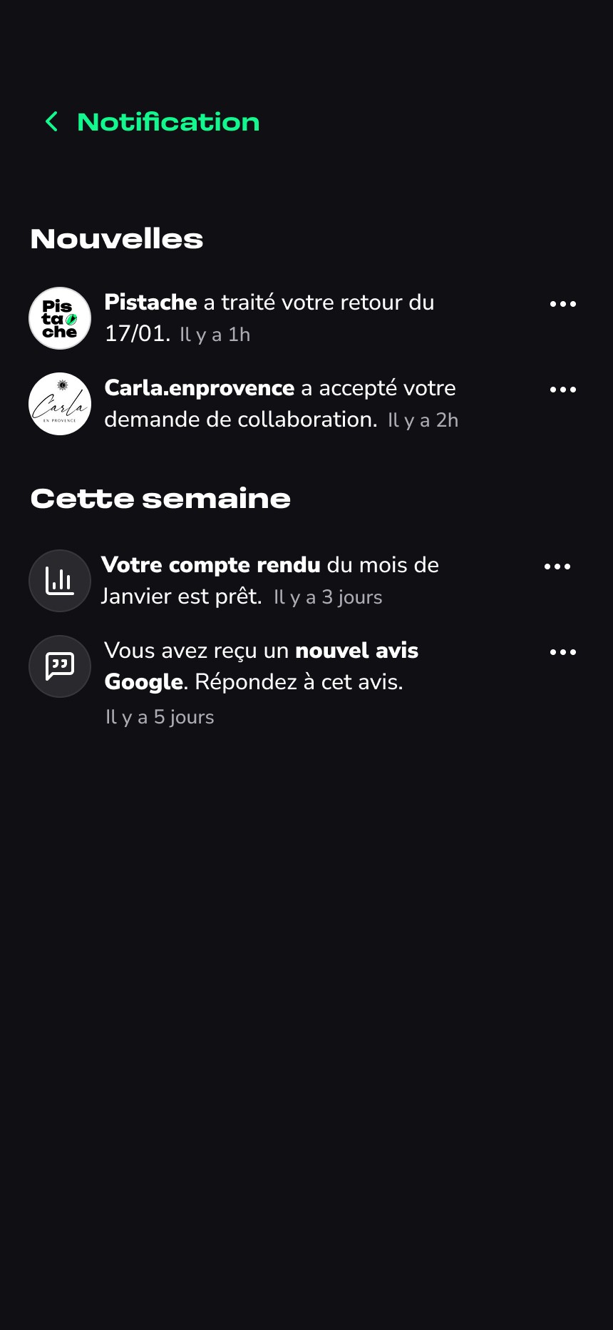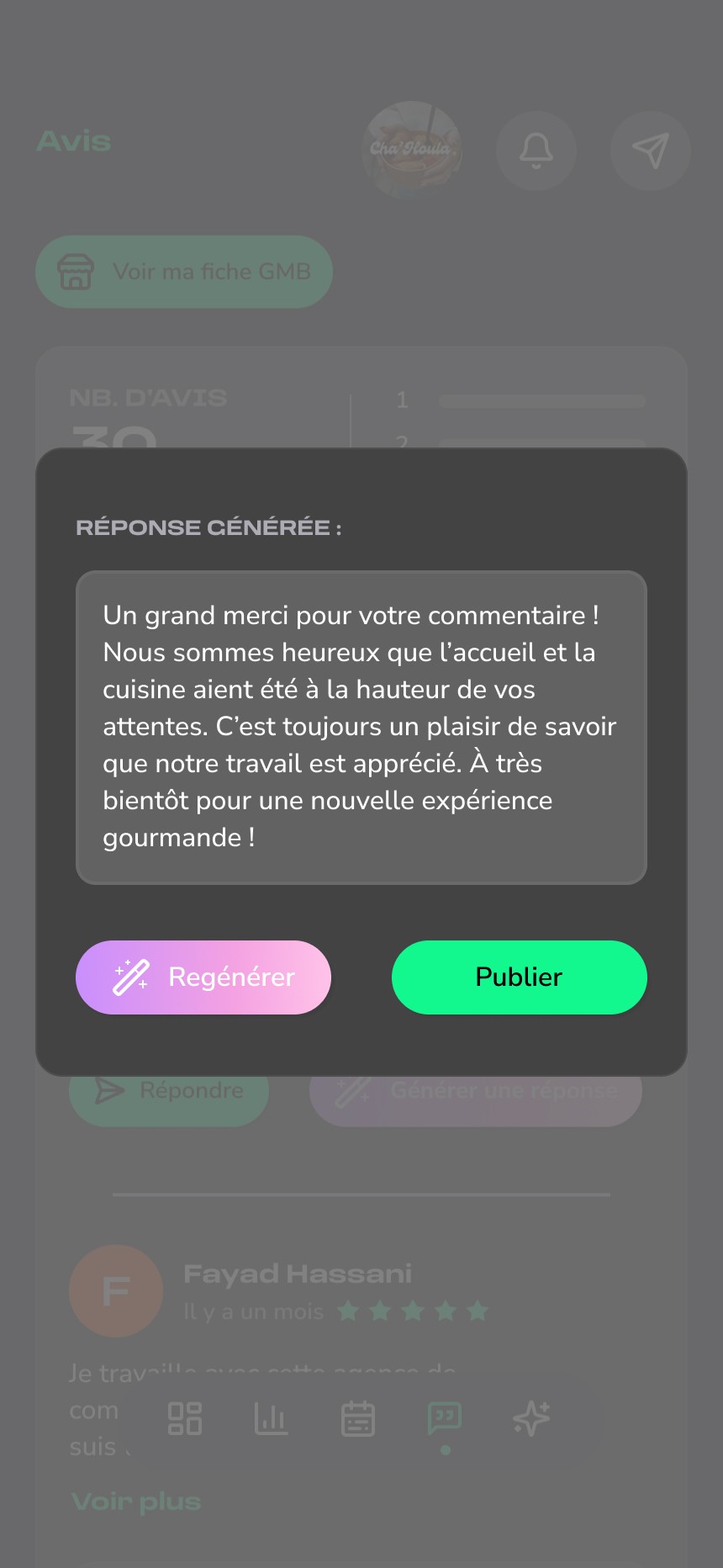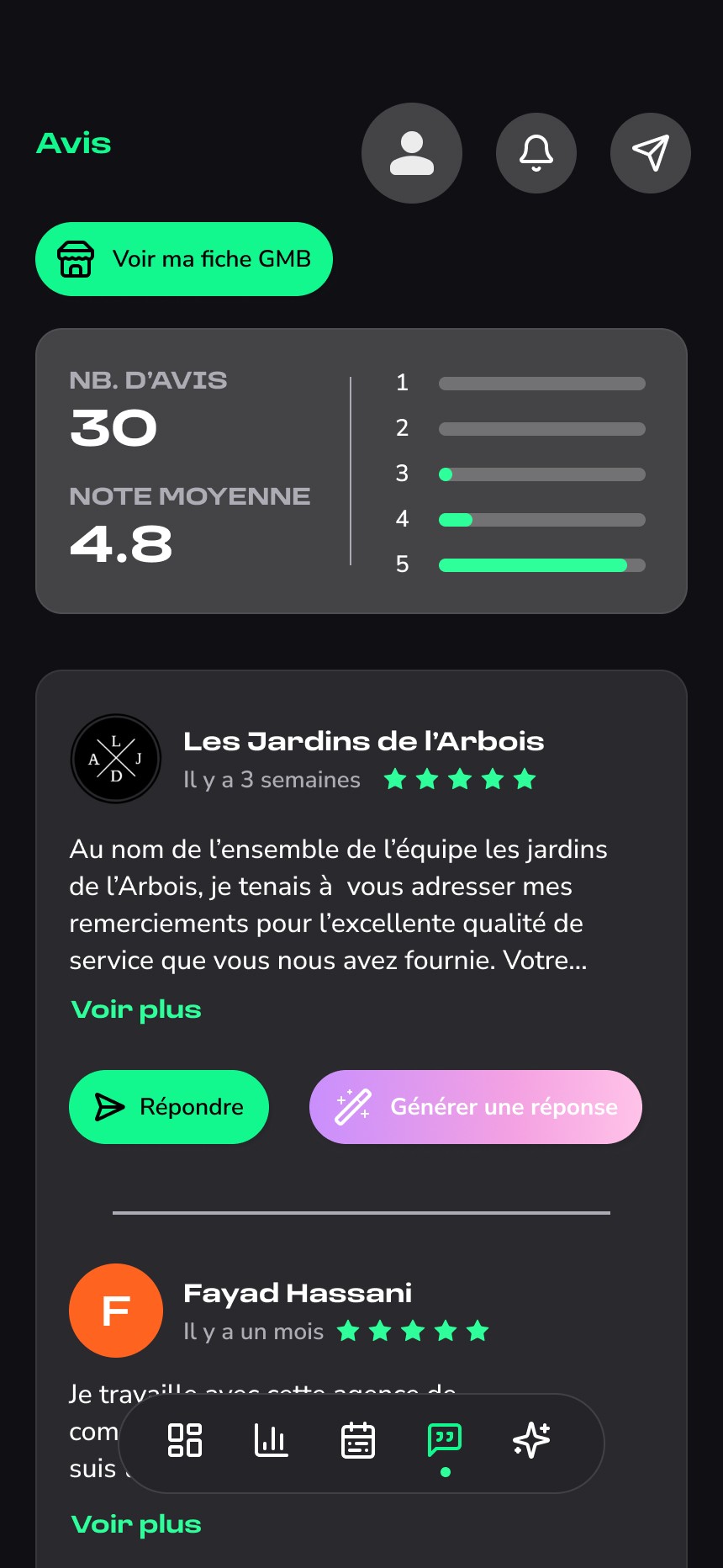 La seconde partie donne accès à un espace de gestion, où l’utilisateur peut consulter le planning des publications, valider ou ajuster les contenus générés, et suivre à terme différentes informations liées à sa présence en ligne.