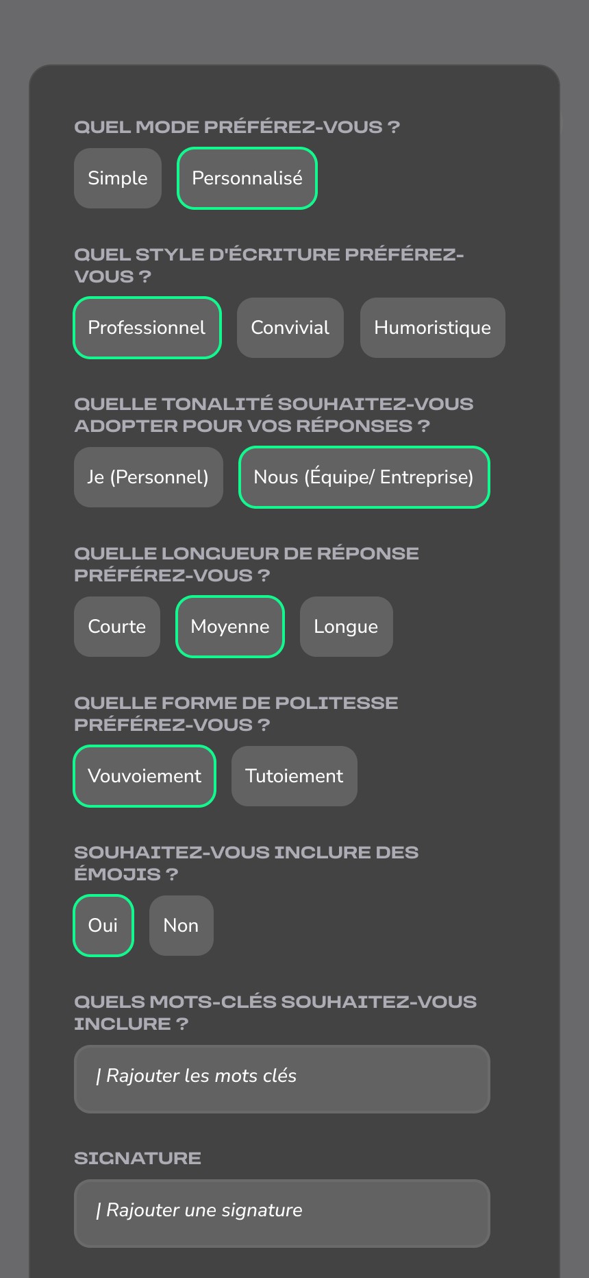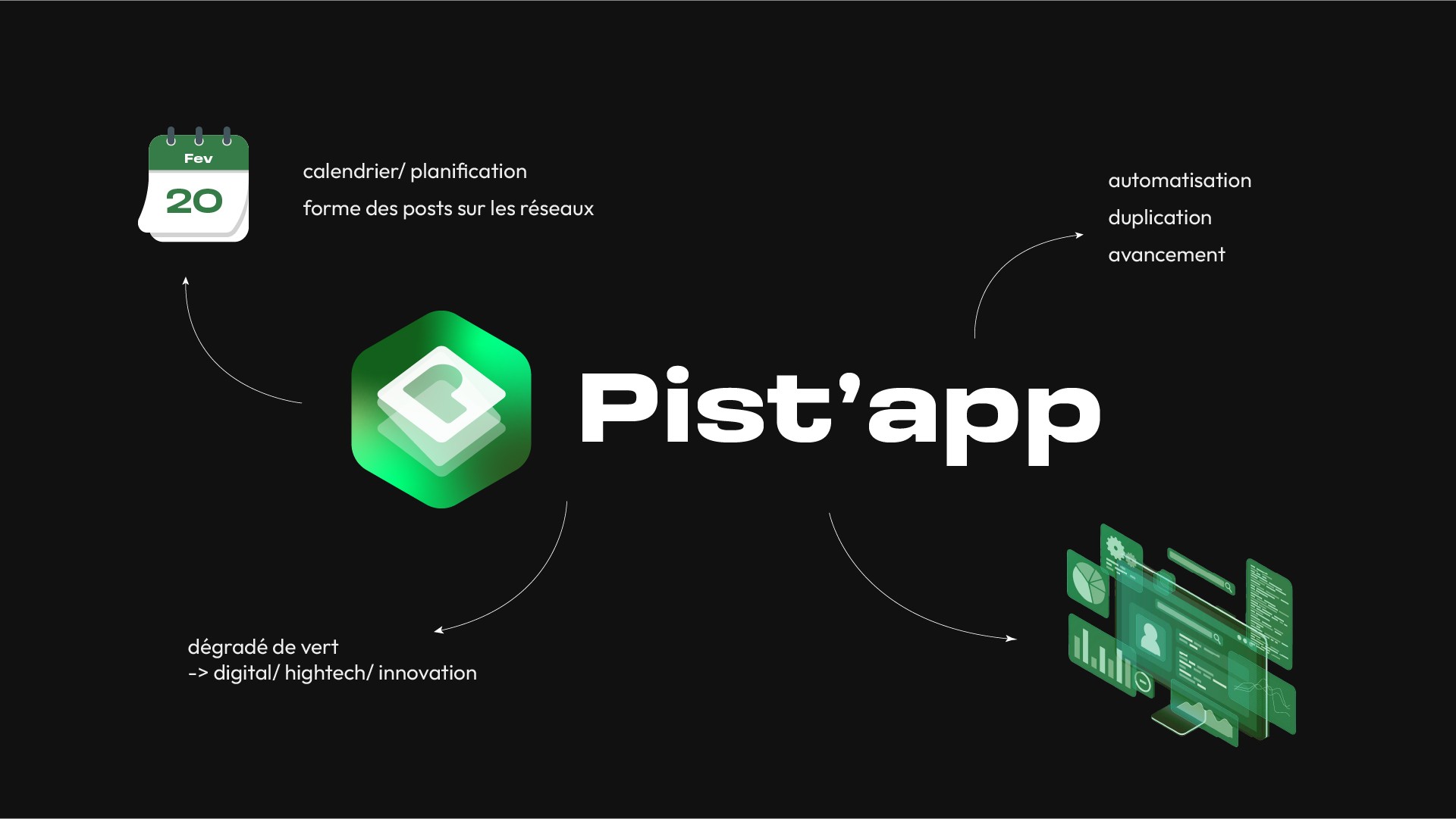 L’ensemble repose ainsi sur un langage visuel conceptuel, pensé pour traduire l’automatisation, la fluidité et l’efficacité de l’outil. Les angles arrondis apportent une touche de modernité et d’accessibilité, tandis que le dégradé de vert renforce l’univers digital, technologique et innovant de l’application.