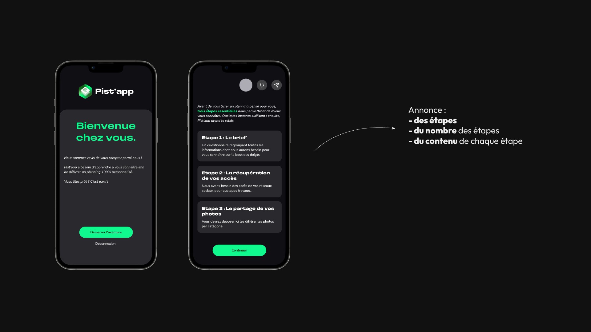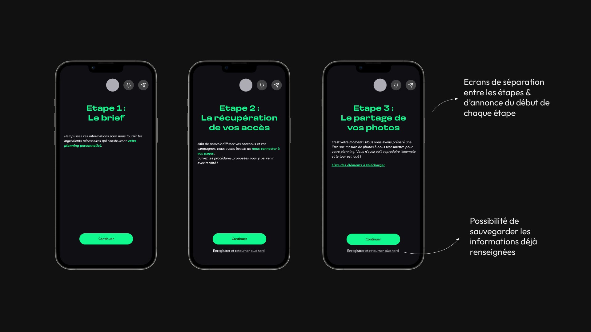 La phase de renseignement des informations étant relativement dense, l’UX a été pensée pour accompagner l’utilisateur à chaque étape. Des écrans de transition, des étapes clairement identifiées et des indicateurs de progression permettent de rendre le parcours simple, lisible et rassurant, en limitant au maximum les points de friction.