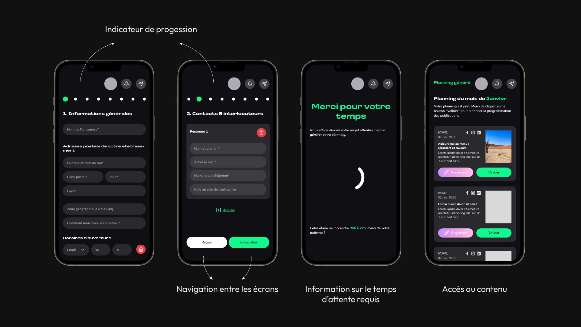 L’application se structure autour de deux grandes phases. La première invite l’utilisateur à renseigner les informations nécessaires à la génération de contenus : identité, réseaux existants, types de publications souhaités ou ressources visuelles. Ces éléments permettent ensuite à l’IA de générer des posts adaptés à son activité.