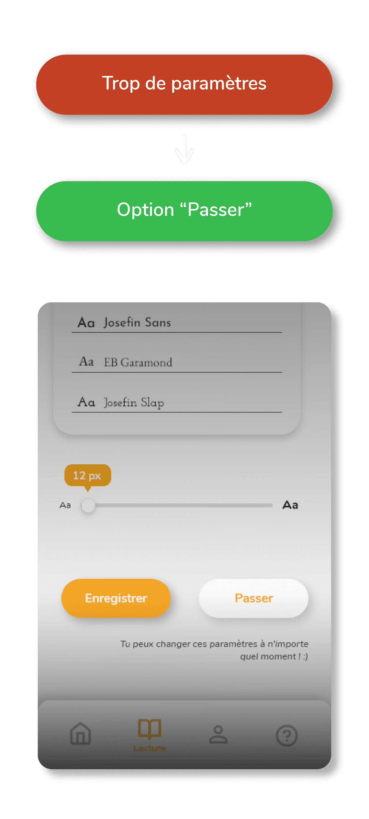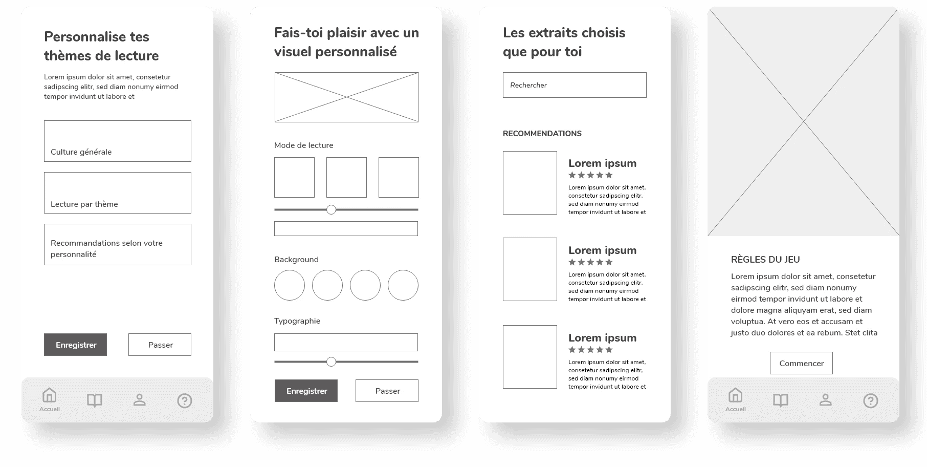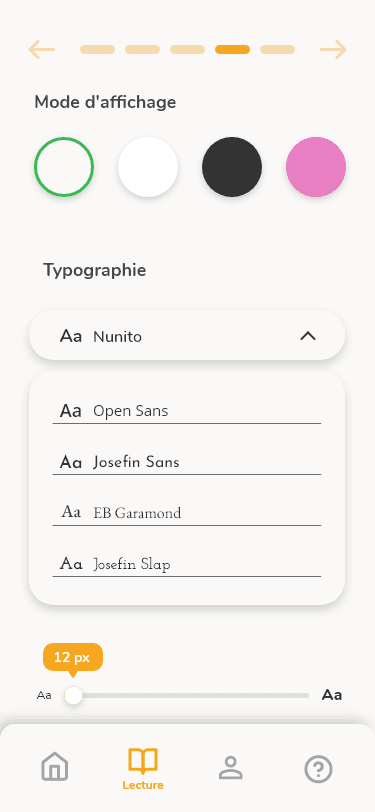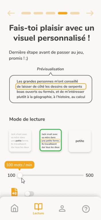 Paramètres pré-lecture : Choix des thèmes, Personnalisation de l'affichage, Choix du texte, Règles du jeu
