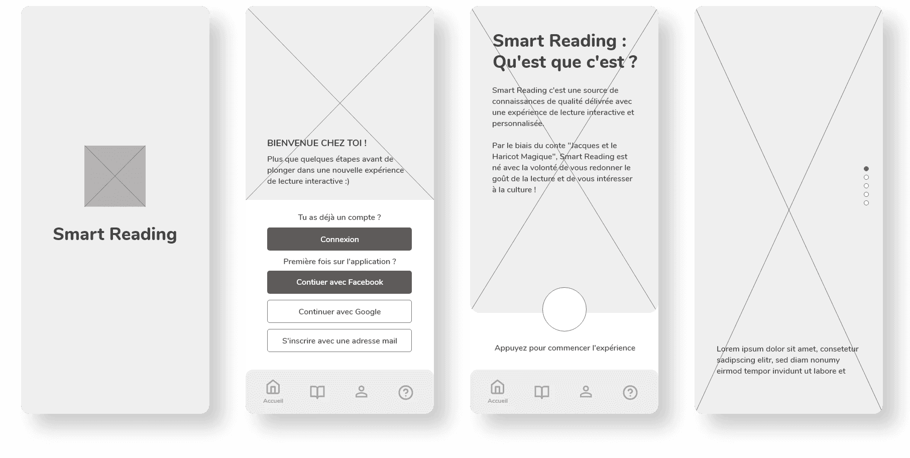 Landing : Écran d'attente, Connexion, Présentation de l'application